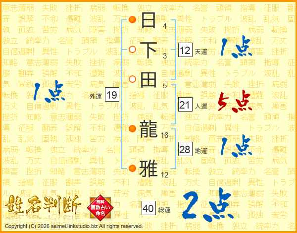 日(4画)下(3画)田(5画) 龍(16画)雅(12画)