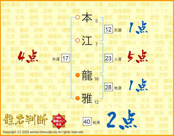 画数の奇数(○陽)と偶数(●陰)の配列で吉凶を占います。どちらかにかたよる名前は大凶名で避ける必要があります。画数の奇数偶数。