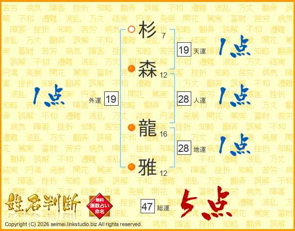 杉(7画)森(12画) 龍(16画)雅(12画)