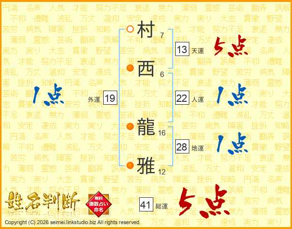 生活面を象徴する運勢です。外部から受ける影響力を表し、結婚運、家庭運や職場、環境への順応性を表します。総運から人運を引いた画数。姓や名が1文字の場合を除く。