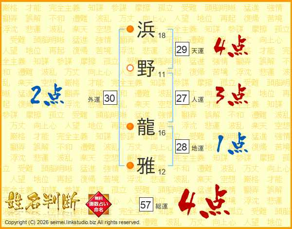 浜(18画)野(11画) 龍(16画)雅(12画)