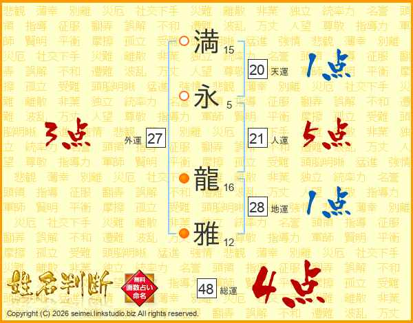 満(15画)永(5画) 龍(16画)雅(12画)