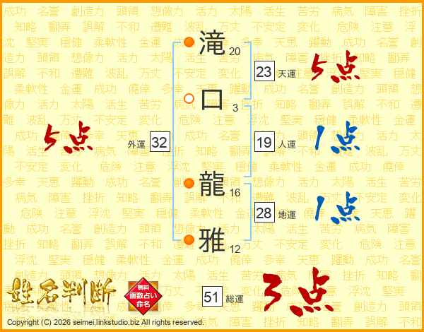 滝(20画)口(3画) 龍(16画)雅(12画)