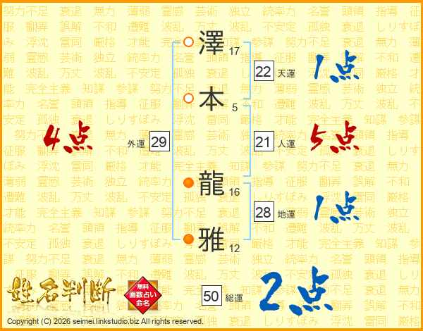 澤(17画)本(5画) 龍(16画)雅(12画)