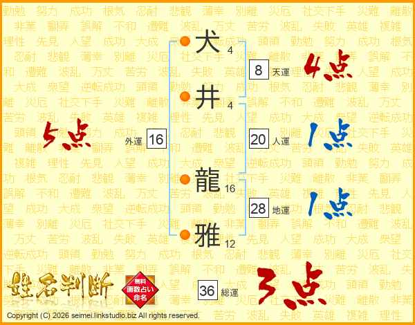 犬(4画)井(4画) 龍(16画)雅(12画)