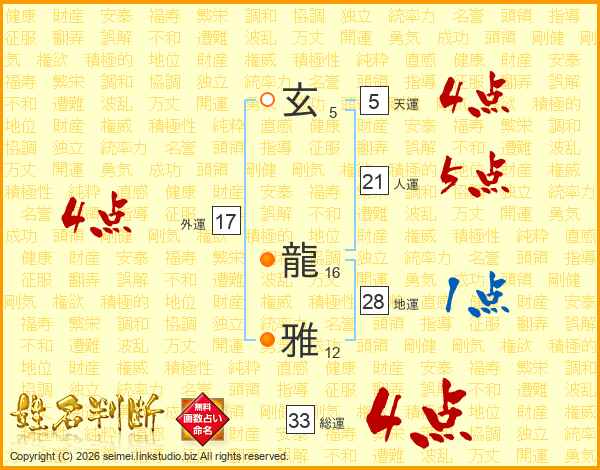 玄龍雅さんの総運は33画の4点!