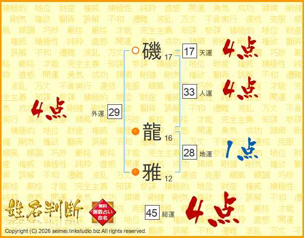 生活面を象徴する運勢です。外部から受ける影響力を表し、結婚運、家庭運や職場、環境への順応性を表します。総運から人運を引いた画数。姓や名が1文字の場合を除く。