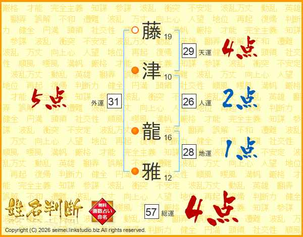藤津龍雅さんの総運は57画の4点!