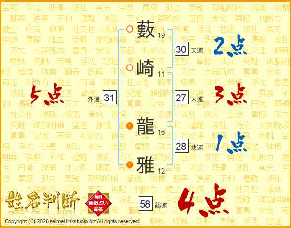 藪(19画)崎(11画) 龍(16画)雅(12画)