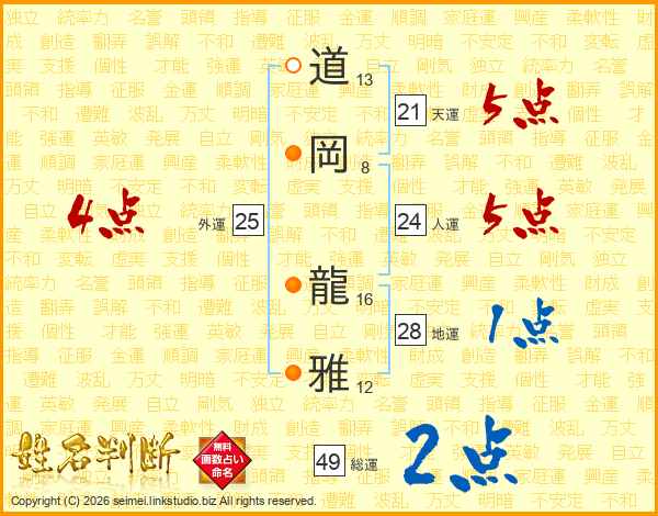 道(13画)岡(8画) 龍(16画)雅(12画)