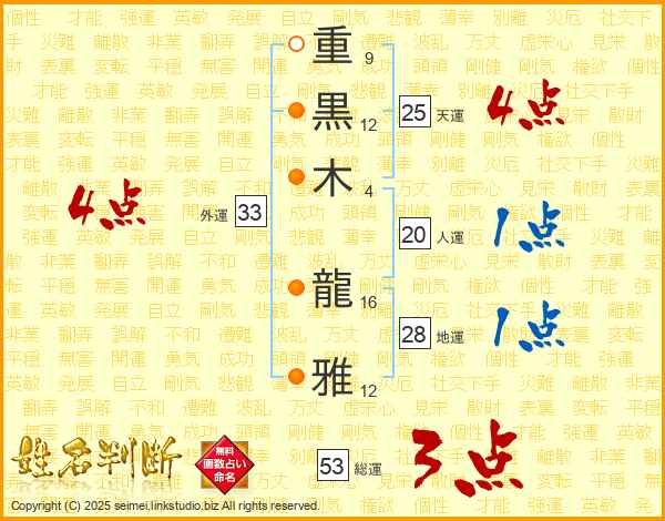 重(9画)黒(12画)木(4画) 龍(16画)雅(12画)