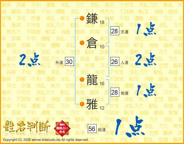 鎌(18画)倉(10画) 龍(16画)雅(12画)