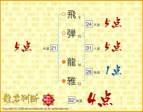 飛(9画)弾(15画) 龍(16画)雅(12画)