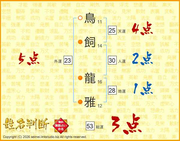 鳥(11画)飼(14画) 龍(16画)雅(12画)