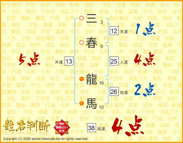 三春龍馬さんの総運は38画の4点!