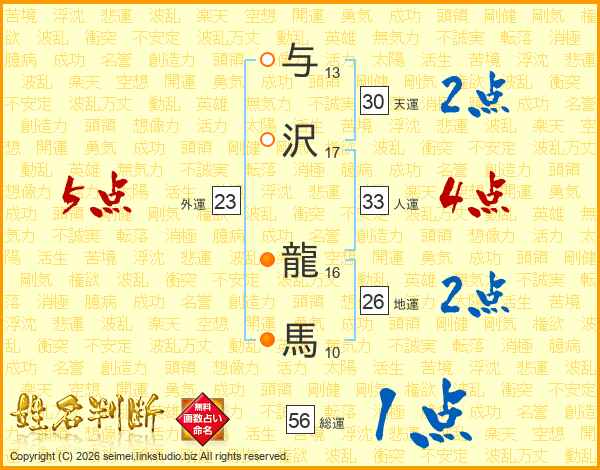 与(13画)沢(17画) 龍(16画)馬(10画)