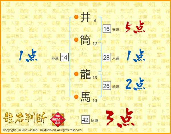 井(4画)筒(12画) 龍(16画)馬(10画)