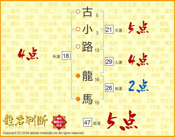 古(5画)小(3画)路(13画) 龍(16画)馬(10画)