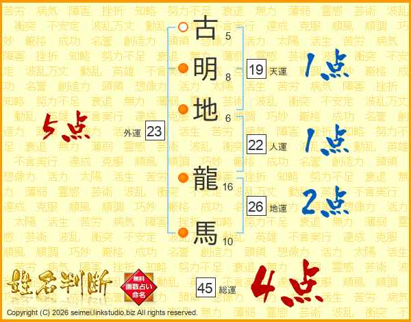 古(5画)明(8画)地(6画) 龍(16画)馬(10画)