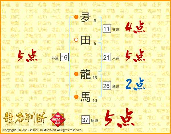 夛(6画)田(5画) 龍(16画)馬(10画)