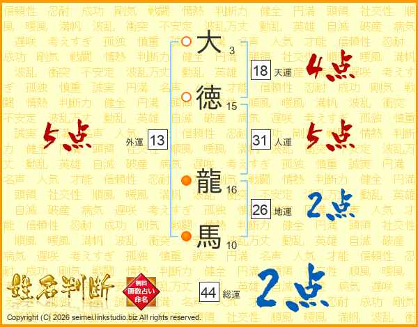 大(3画)徳(15画) 龍(16画)馬(10画)