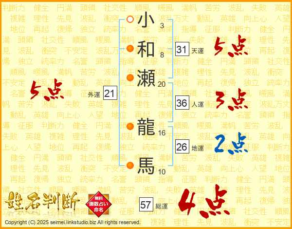 小(3画)和(8画)瀬(20画) 龍(16画)馬(10画)
