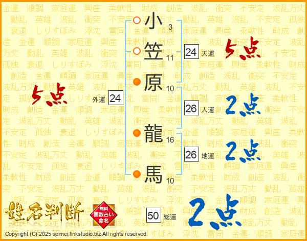 小(3画)笠(11画)原(10画) 龍(16画)馬(10画)