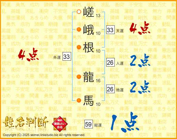 嵯(13画)峨(10画)根(10画) 龍(16画)馬(10画)