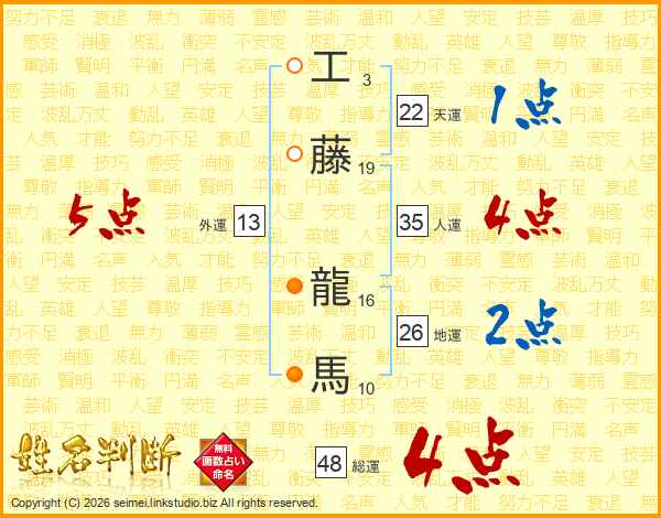 工(3画)藤(19画) 龍(16画)馬(10画)