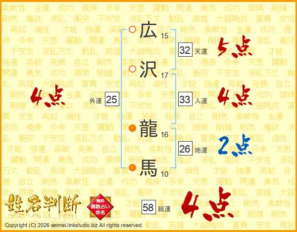 広(15画)沢(17画) 龍(16画)馬(10画)