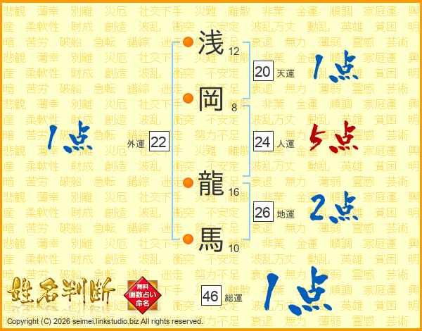 浅(12画)岡(8画) 龍(16画)馬(10画)