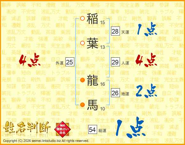 稲(15画)葉(13画) 龍(16画)馬(10画)