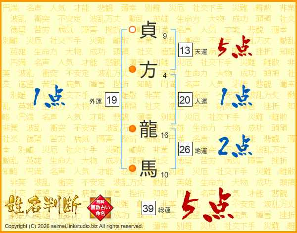 貞(9画)方(4画) 龍(16画)馬(10画)