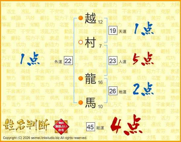 越村龍馬さんの総運は45画の4点!
