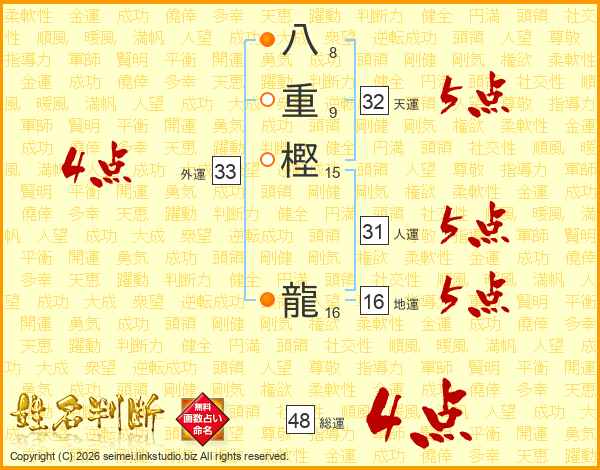 八重樫龍さんの総運は48画の4点!
