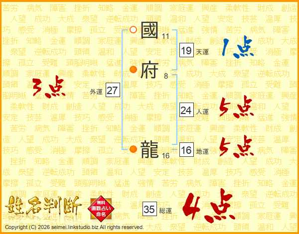 生活面を象徴する運勢です。外部から受ける影響力を表し、結婚運、家庭運や職場、環境への順応性を表します。総運から人運を引いた画数。姓や名が1文字の場合を除く。