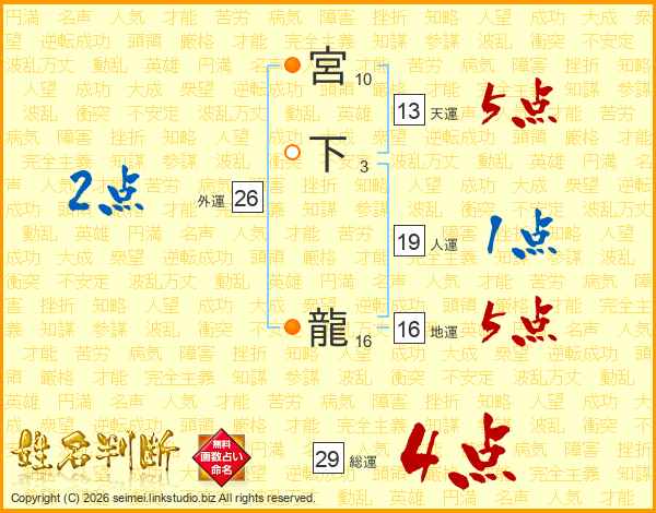 宮下龍さんの総運は29画の4点!