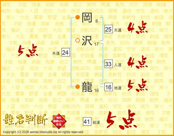 家系が持つ宿命的な運勢を表します。祖先から受け継いだ苗字ですので自分の力が及びません。家柄を象徴します。苗字の合計画数。