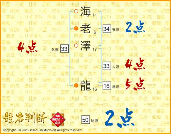 海(11画)老(6画)澤(17画) 龍(16画)