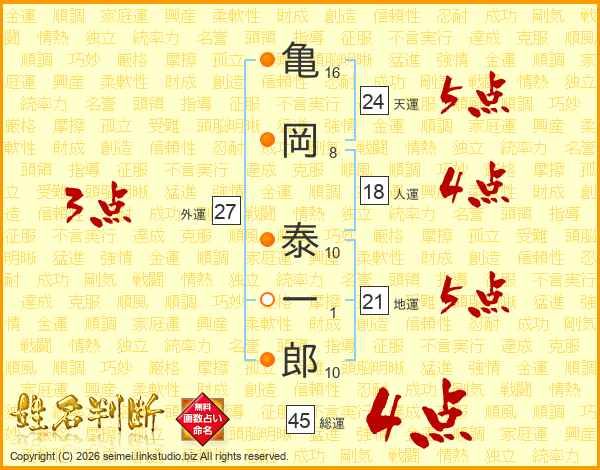 亀(16画)岡(8画) 泰(10画)一(1画)郎(10画)