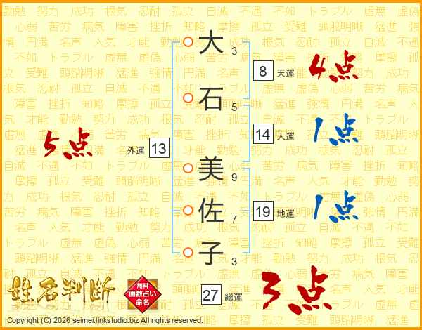 大(3画)石(5画) 美(9画)佐(7画)子(3画)