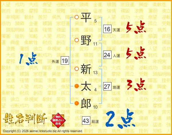 平(5画)野(11画) 新(13画)太(4画)郎(10画)