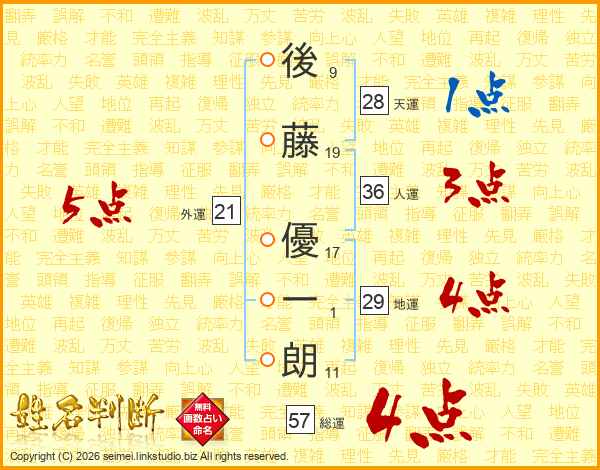 後(9画)藤(19画) 優(17画)一(1画)朗(11画)