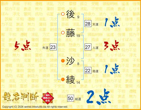 後(9画)藤(19画) 沙(8画)綾(14画)