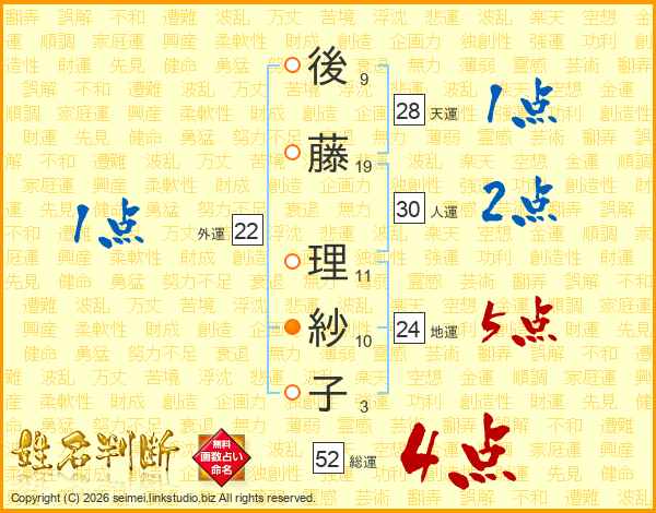 後(9画)藤(19画) 理(11画)紗(10画)子(3画)