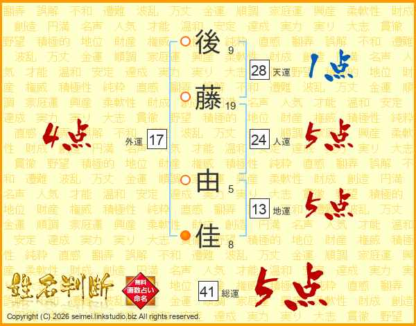 後(9画)藤(19画) 由(5画)佳(8画)