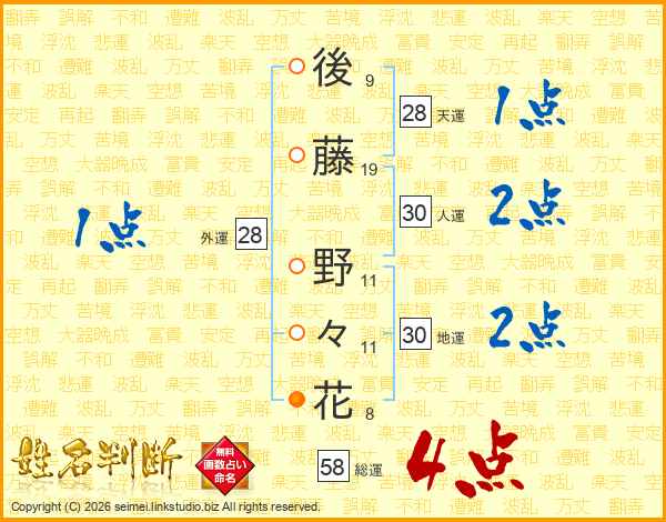 後(9画)藤(19画) 野(11画)々(11画)花(8画)