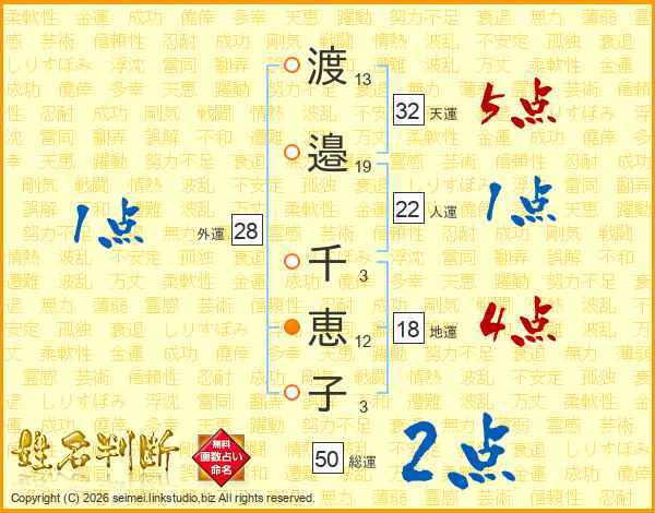 渡邉千恵子さんの天運は32画の5点!
