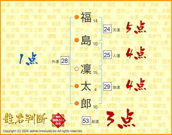 福(14画)島(10画) 凜(15画)太(4画)郎(10画)